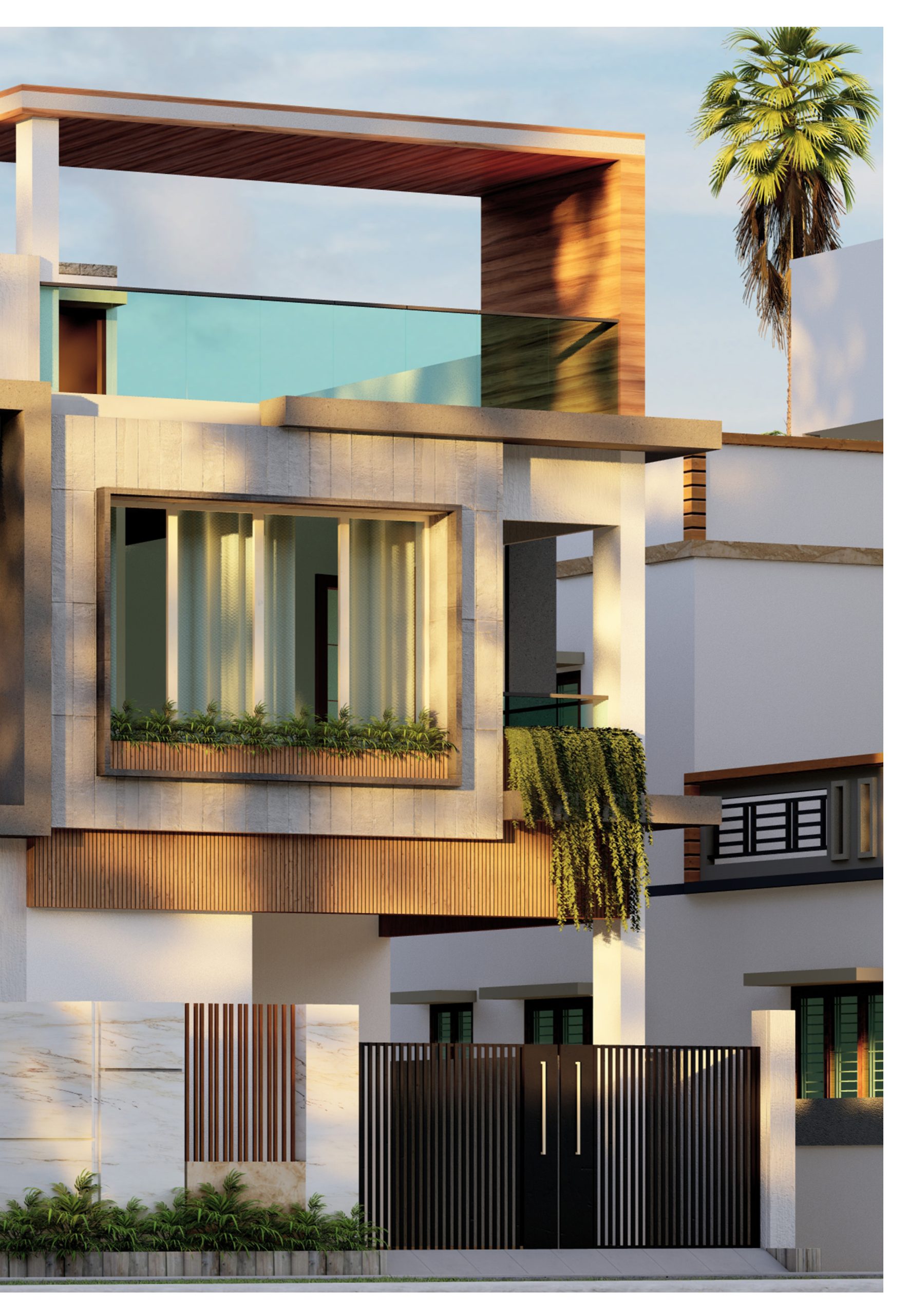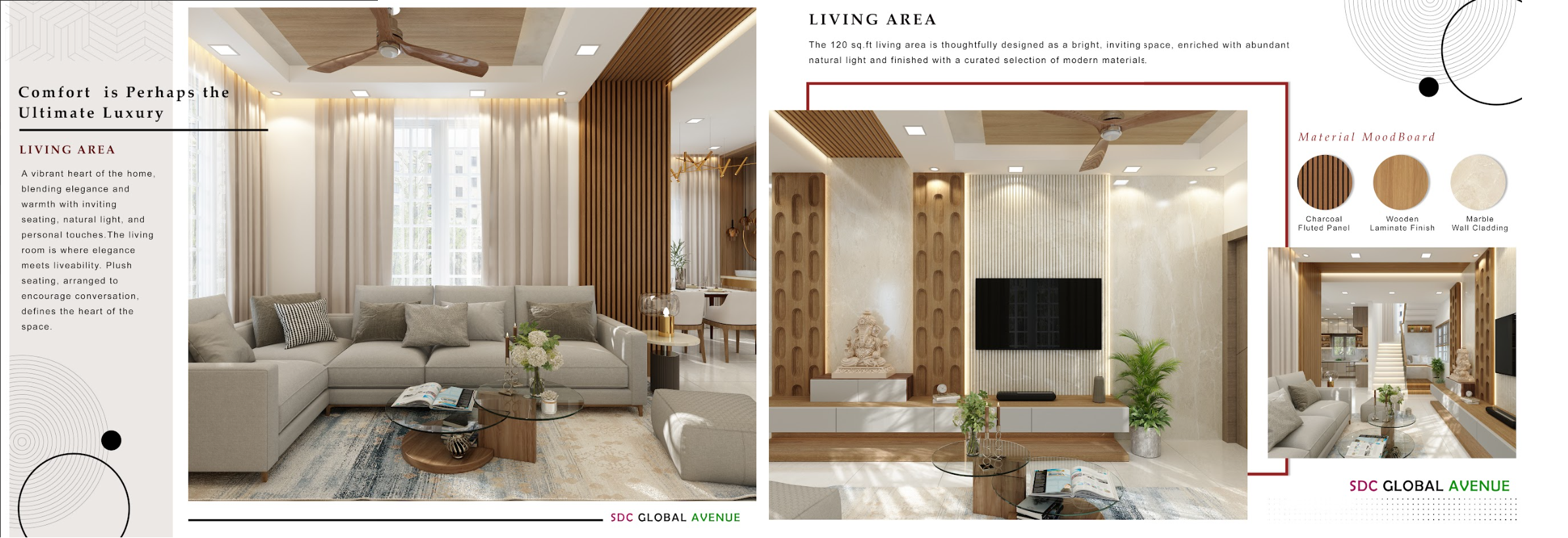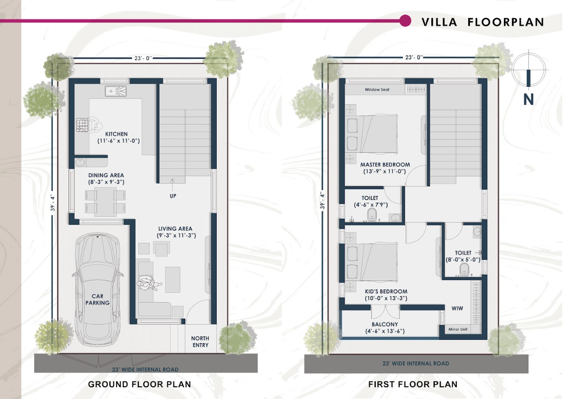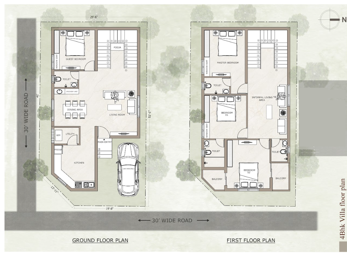 This document presents a two-level layout for a 4BHK villa. The ground floor includes car port, living and dining, kitchen with utility, guest bedroom and prayer room. The first floor contains master bedroom with attached bath, two additional bedrooms, family lounge and balcony.